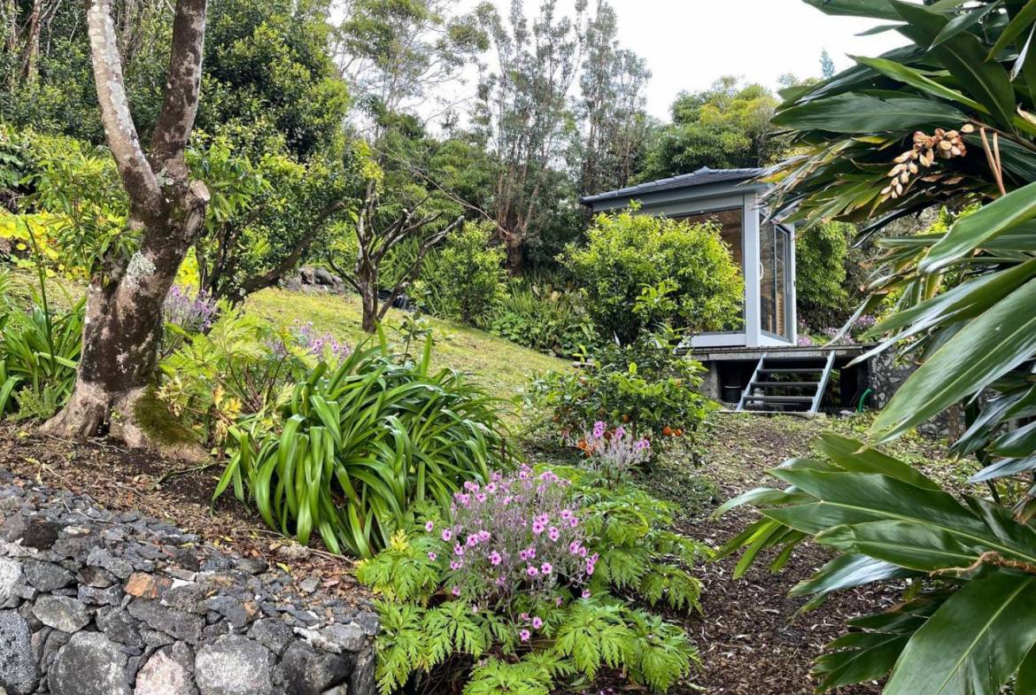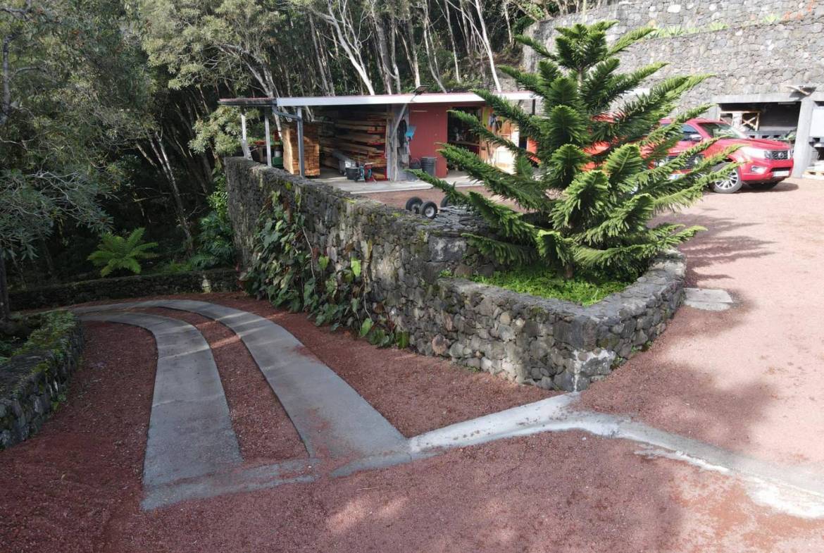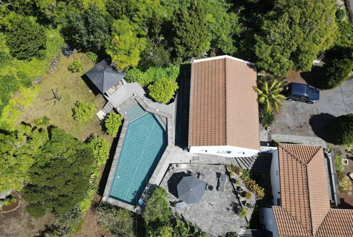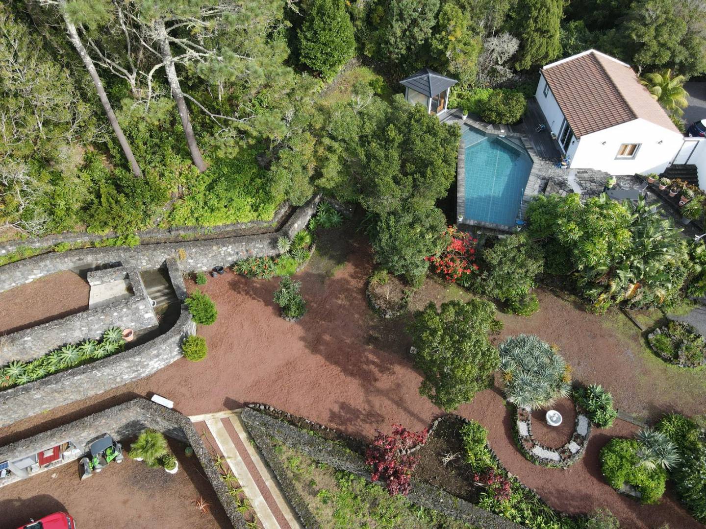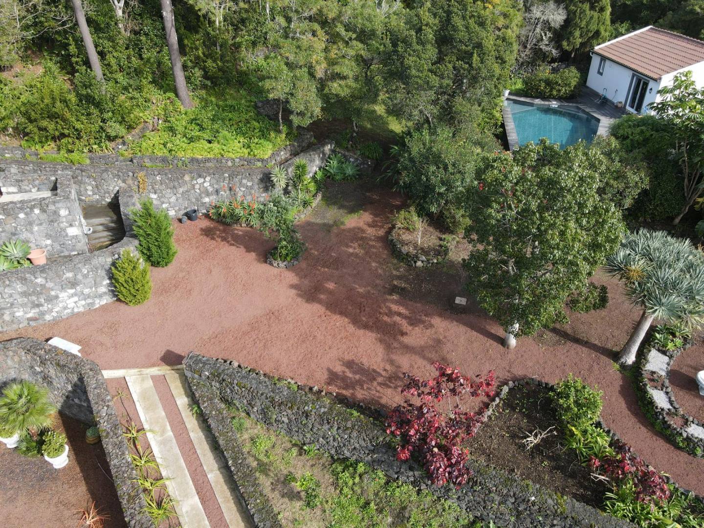 De buitenkant van het pand is een masterclass in landschapsarchitectuur, waarbij gebruik wordt gemaakt van het plaatselijke vulkanische ’terra rossa’ om een opvallend contrast te creëren met het levendige groen.