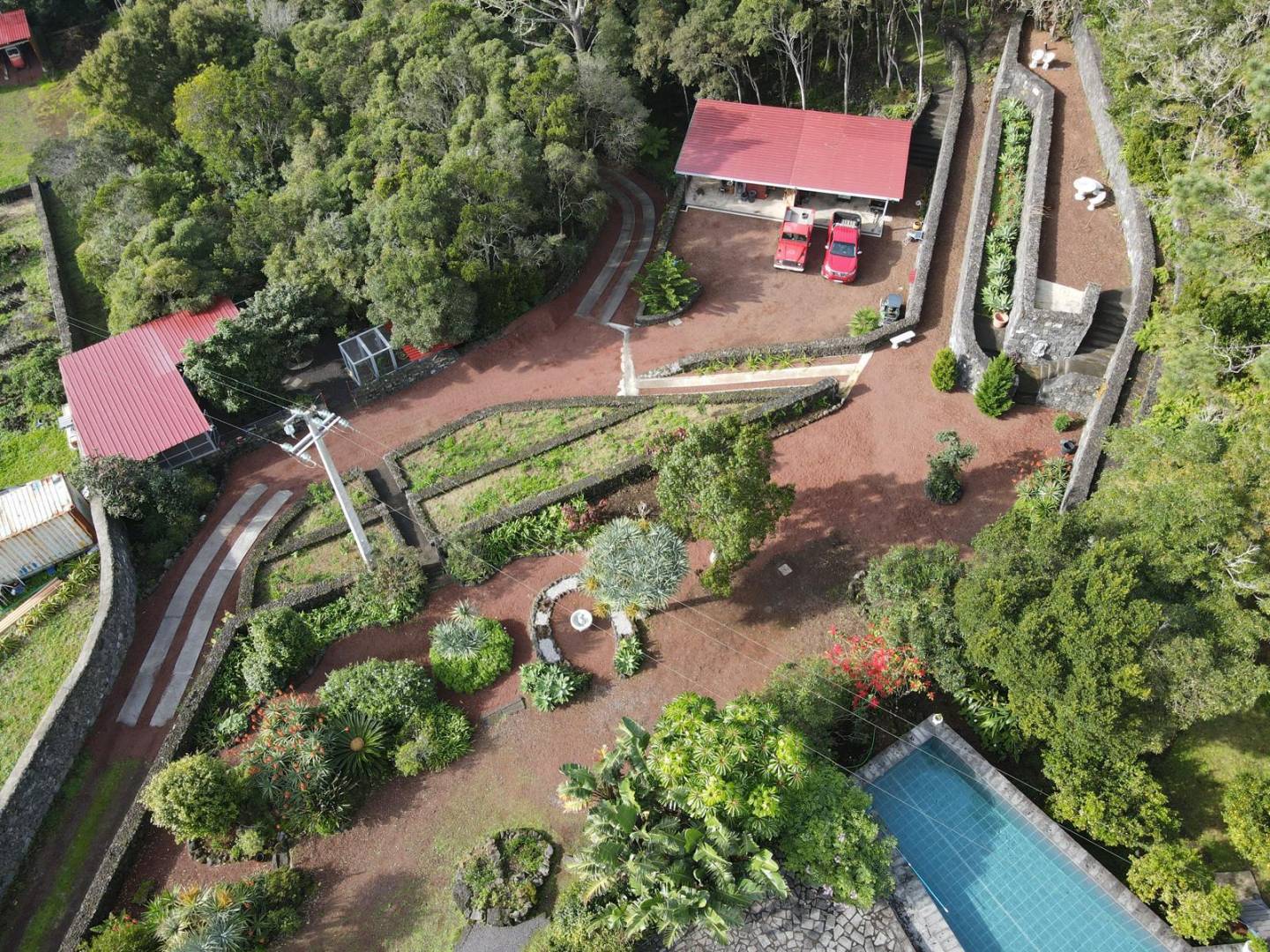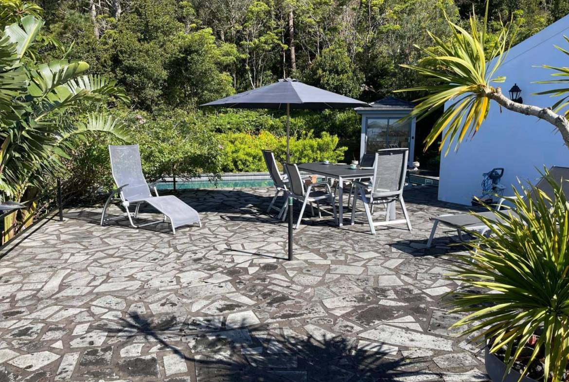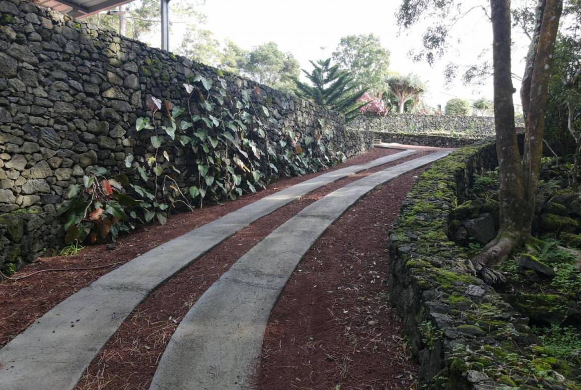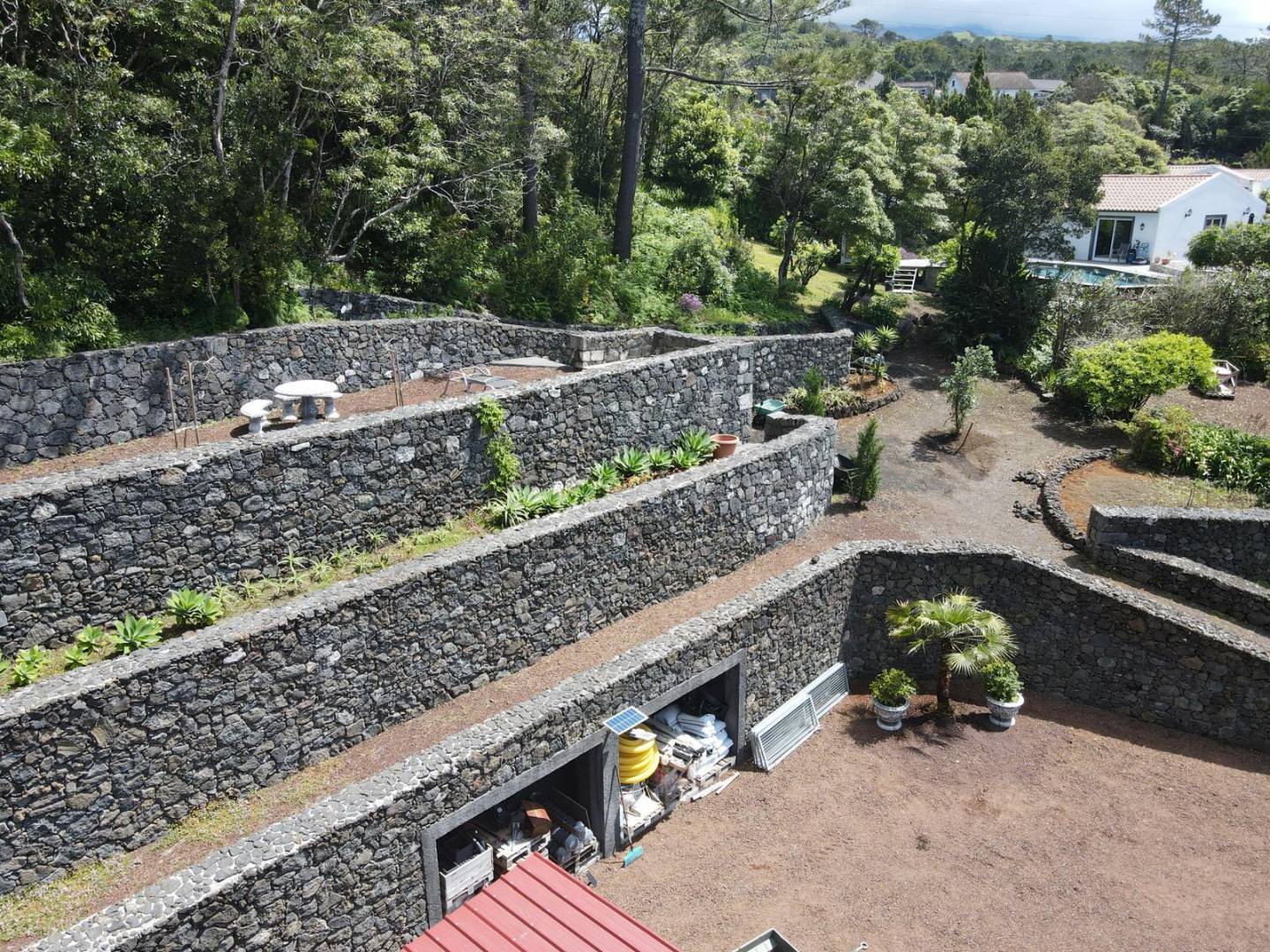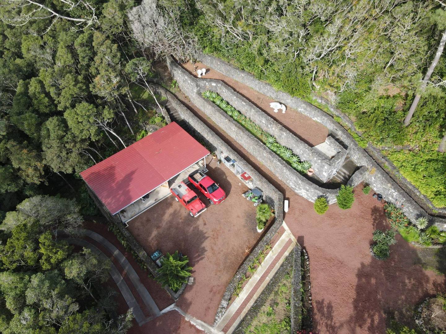 De buitenkant van het pand is een masterclass in landschapsarchitectuur, waarbij gebruik wordt gemaakt van het plaatselijke vulkanische ’terra rossa’ om een opvallend contrast te creëren met het levendige groen.