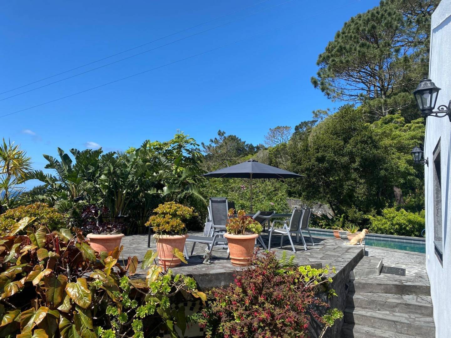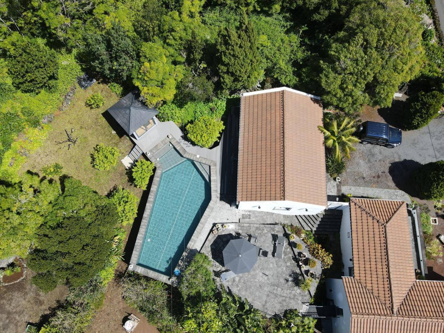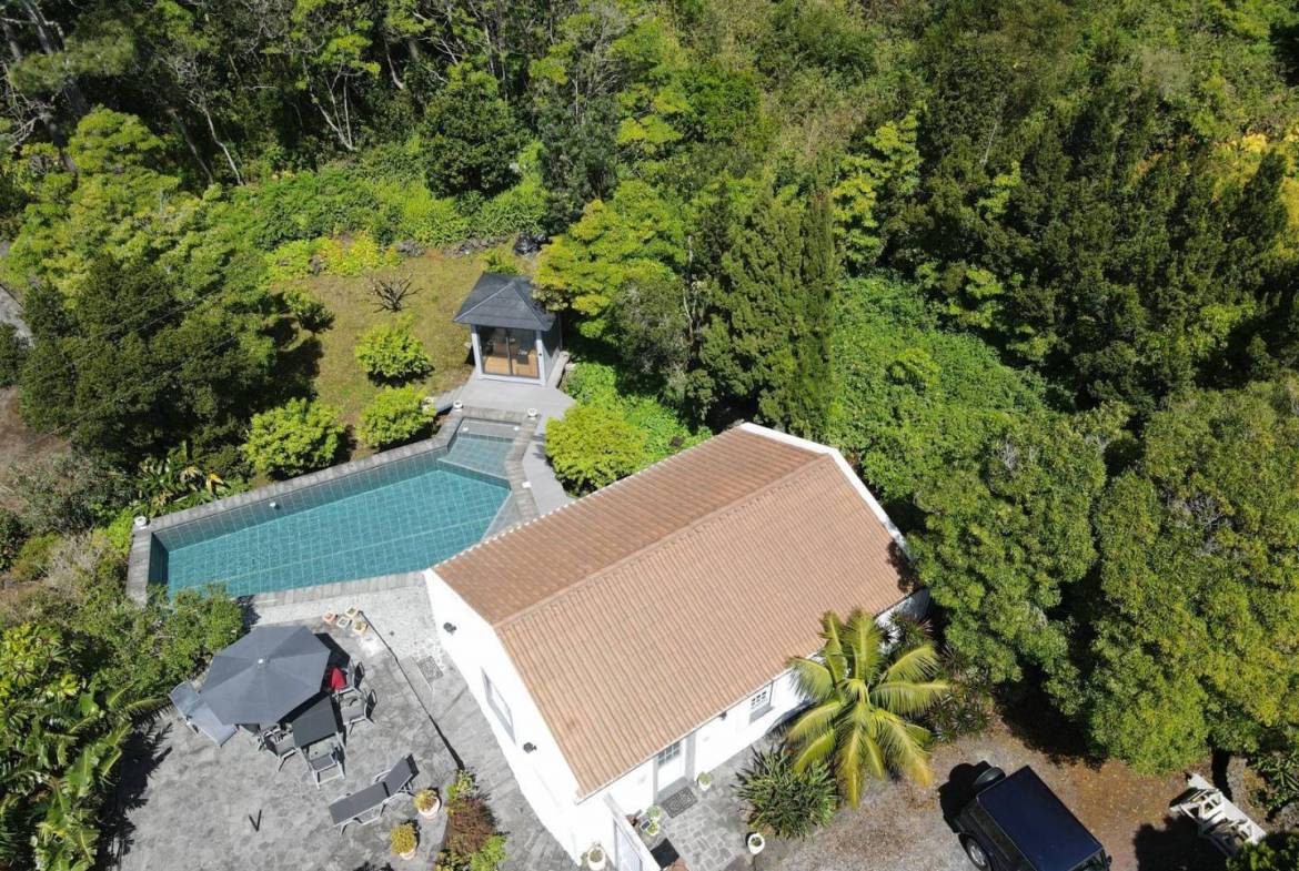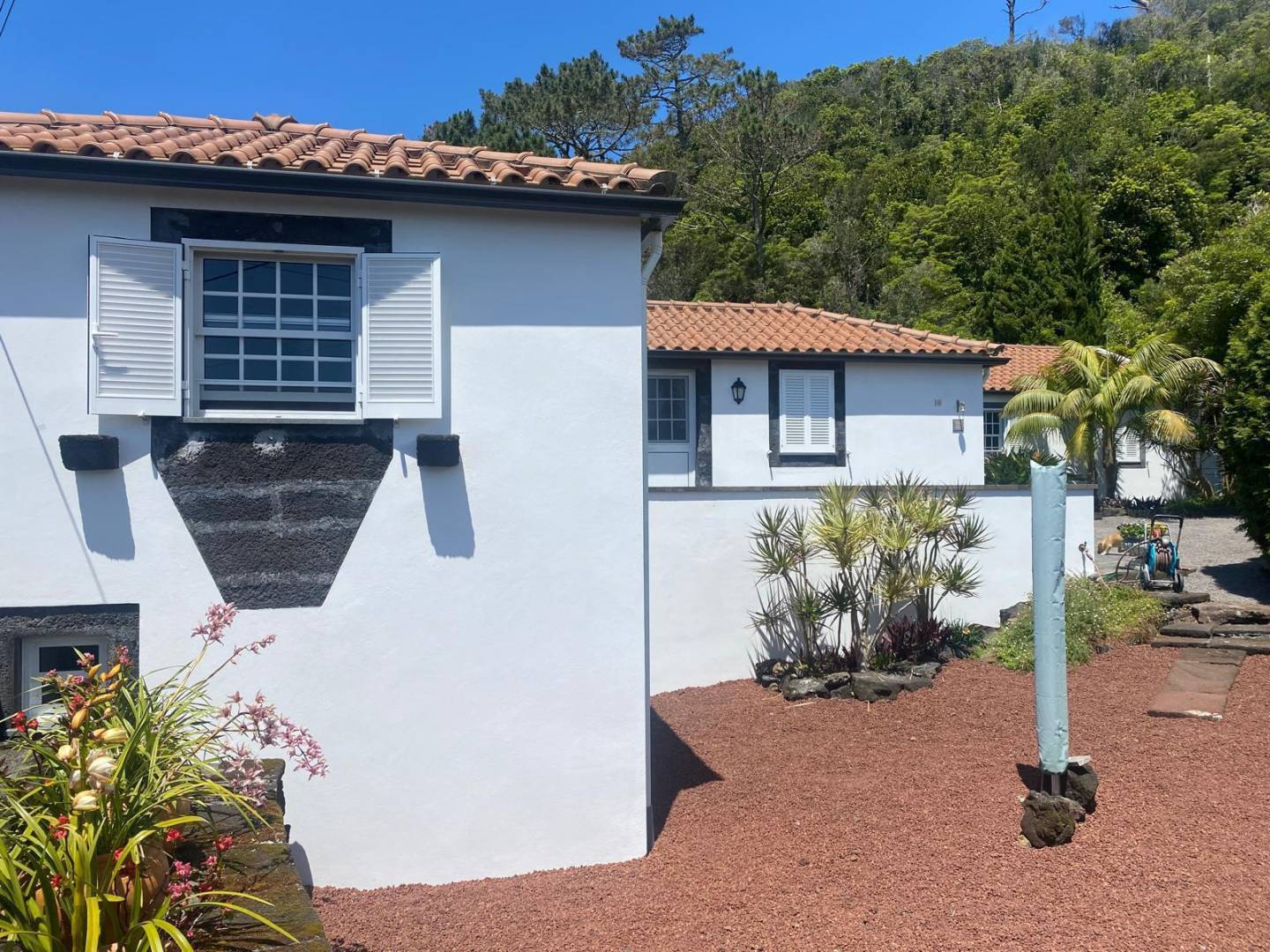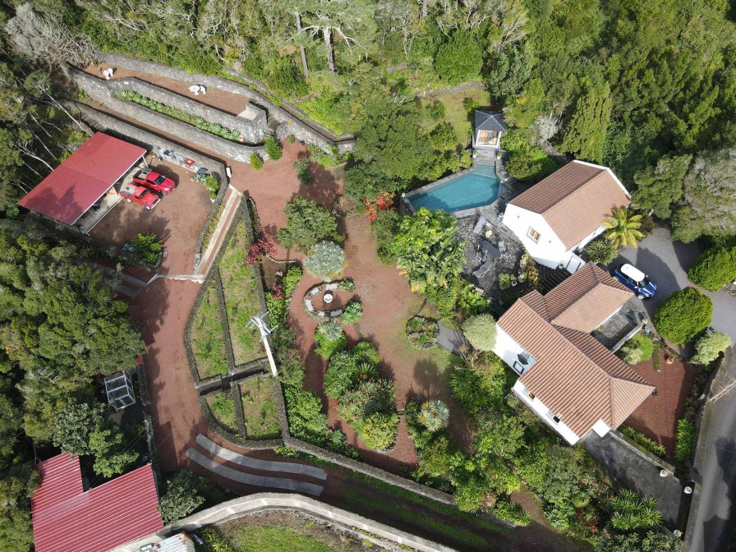 De buitenkant van het pand is een masterclass in landschapsarchitectuur, waarbij gebruik wordt gemaakt van het plaatselijke vulkanische ’terra rossa’ om een opvallend contrast te creëren met het levendige groen.