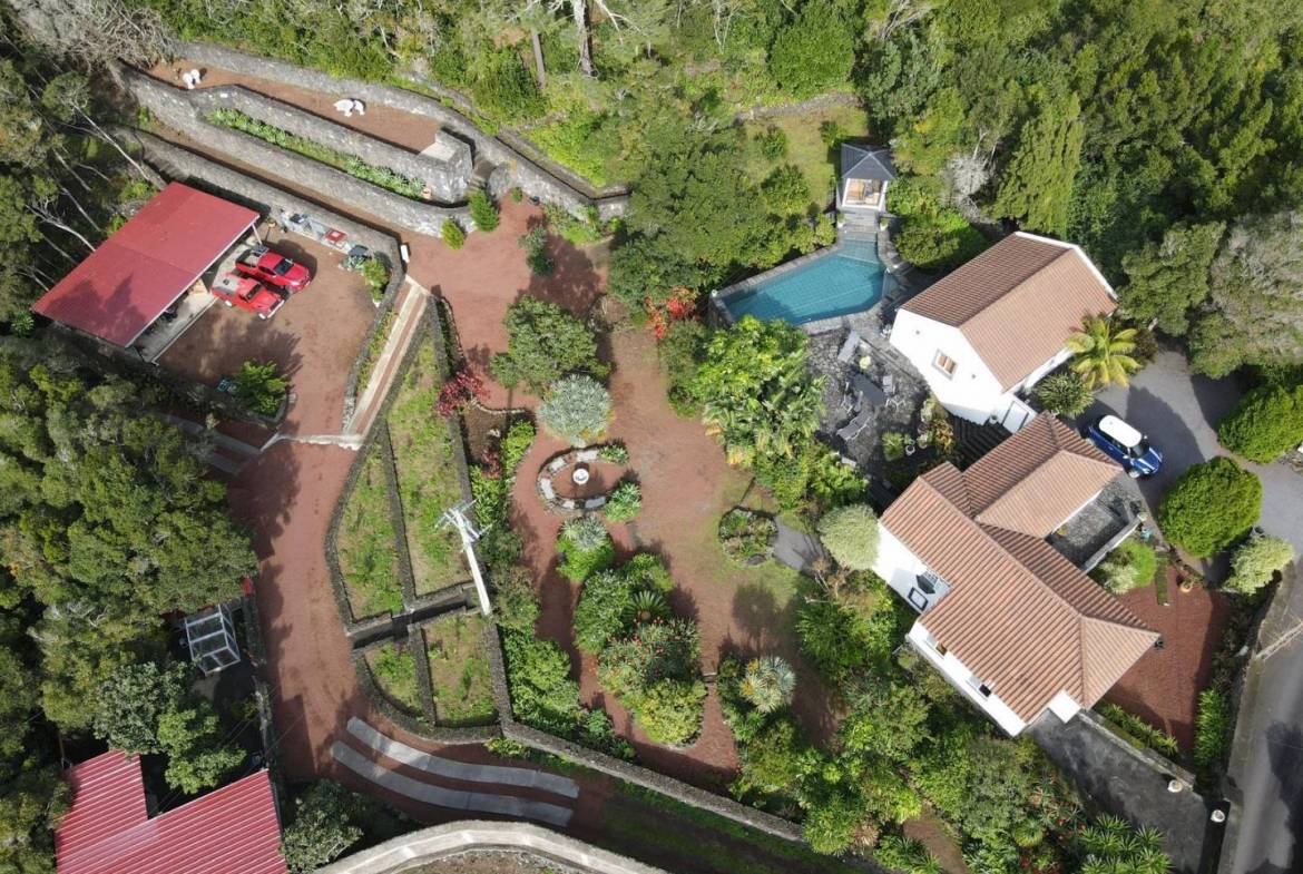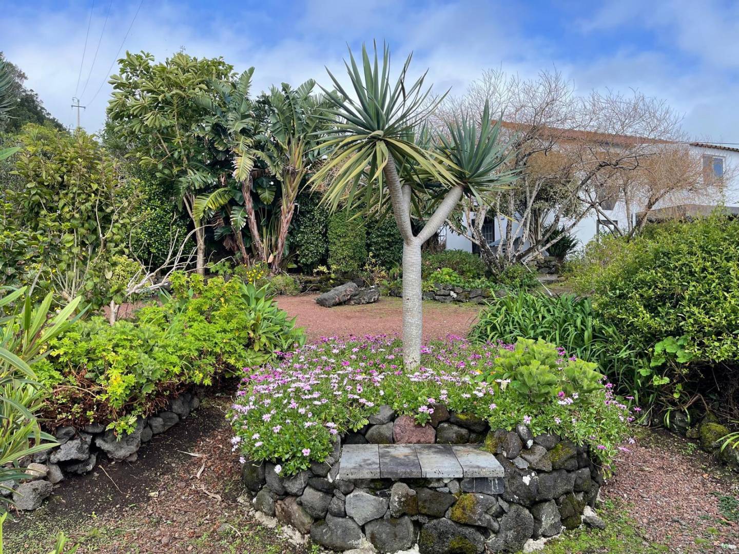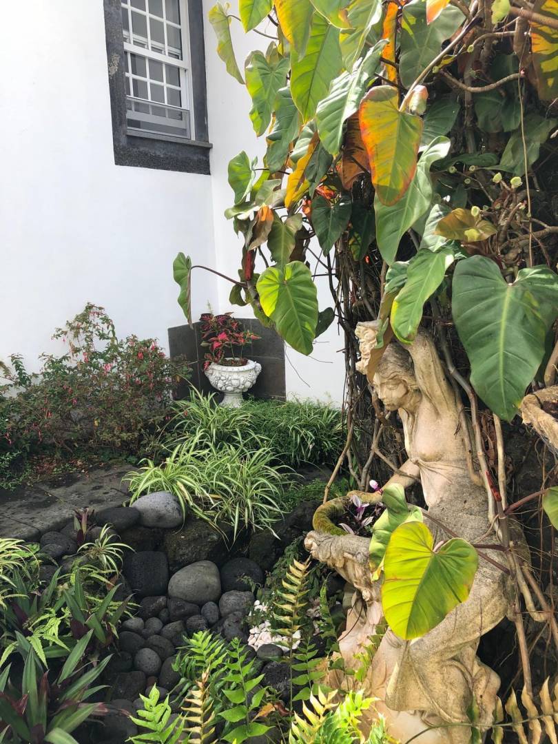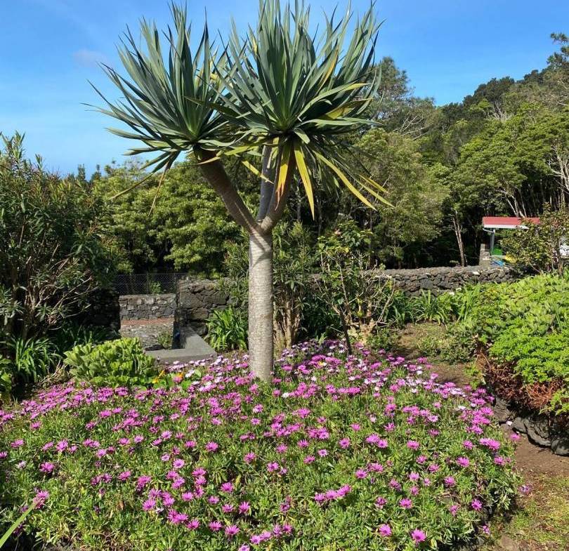 • Architectonische tuinen: Zorgvuldig onderhouden, met stenen ommuurde terrassen en ronde tuinperken tonen exotische flora, waaronder drakenbomen en palmen.