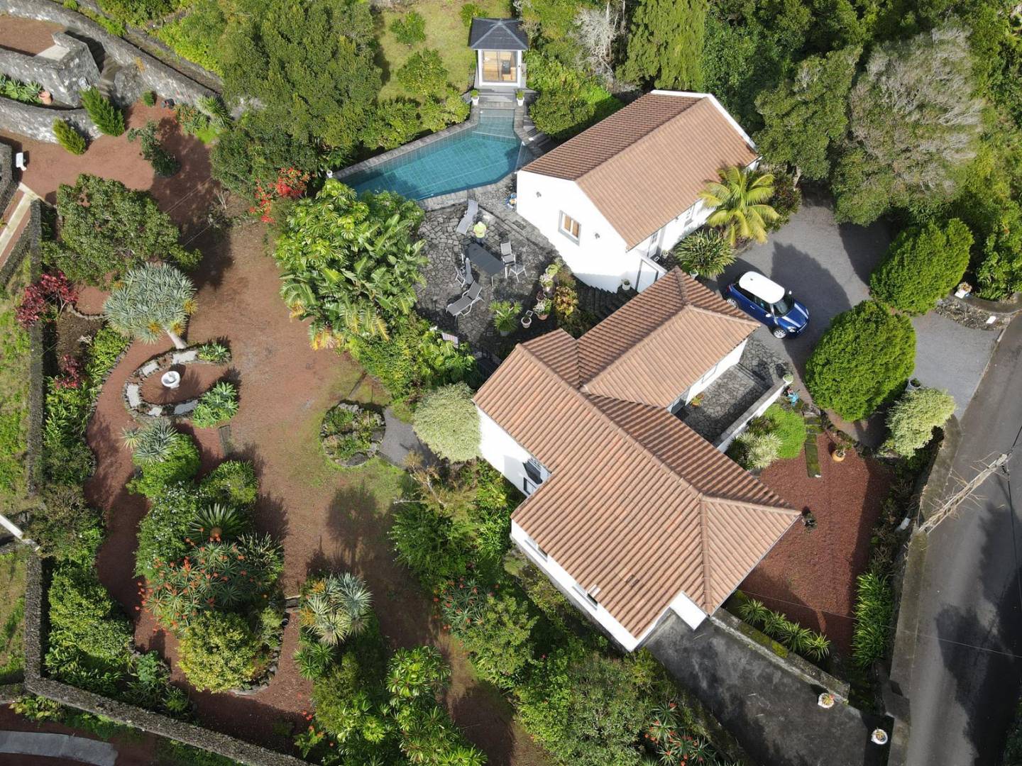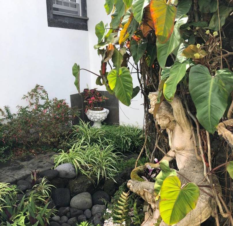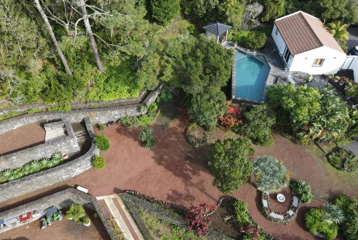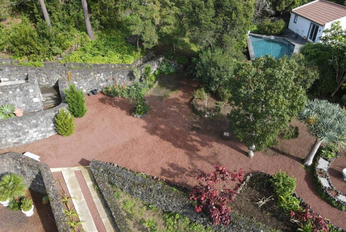 • Architectonische tuinen: Zorgvuldig onderhouden, met stenen ommuurde terrassen en ronde tuinperken tonen exotische flora, waaronder drakenbomen en palmen.