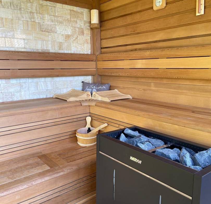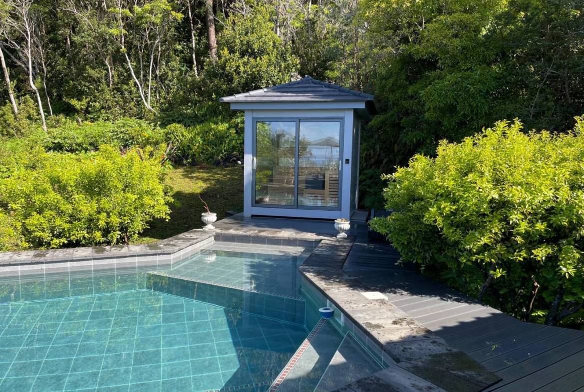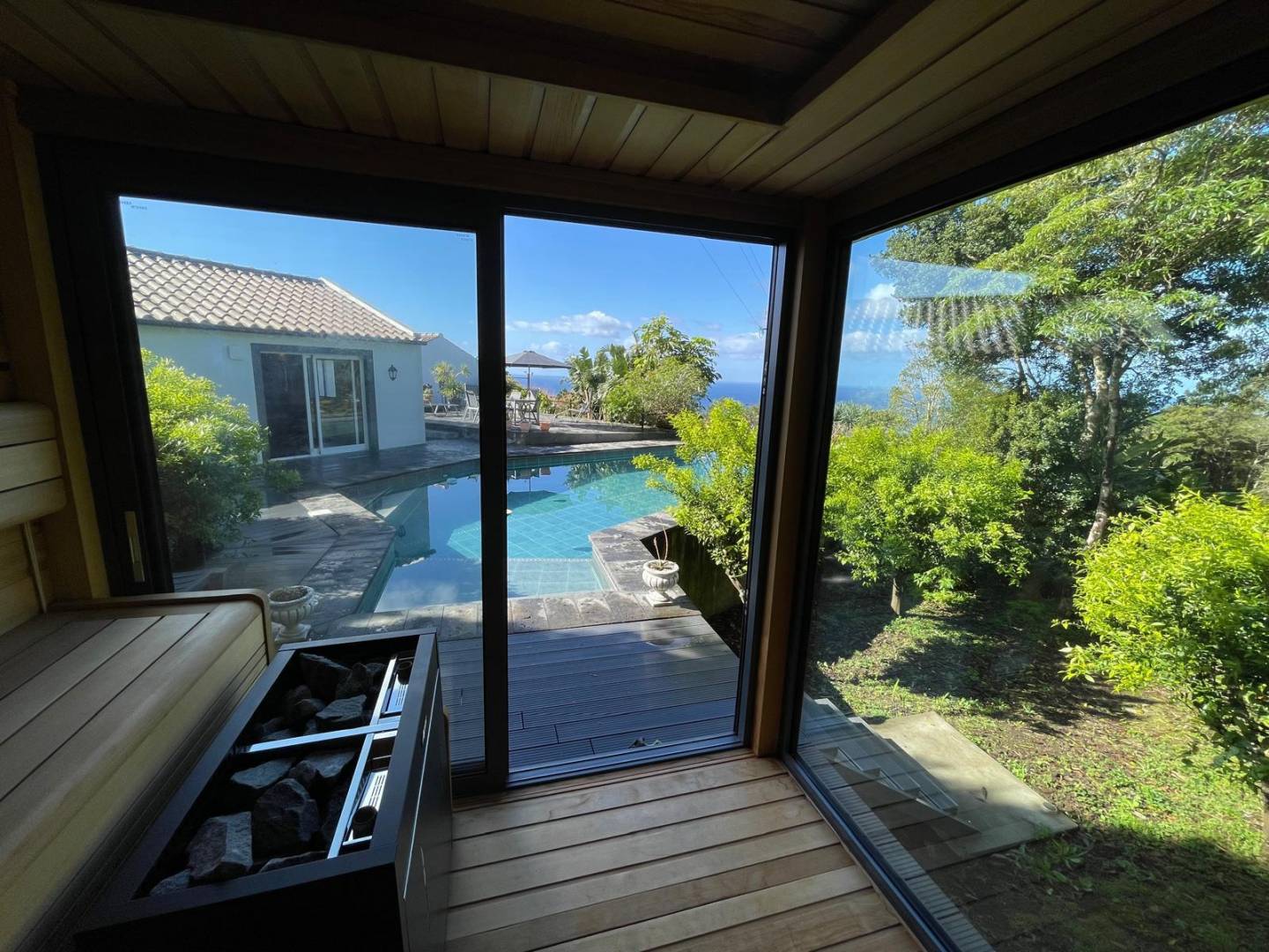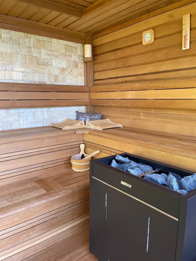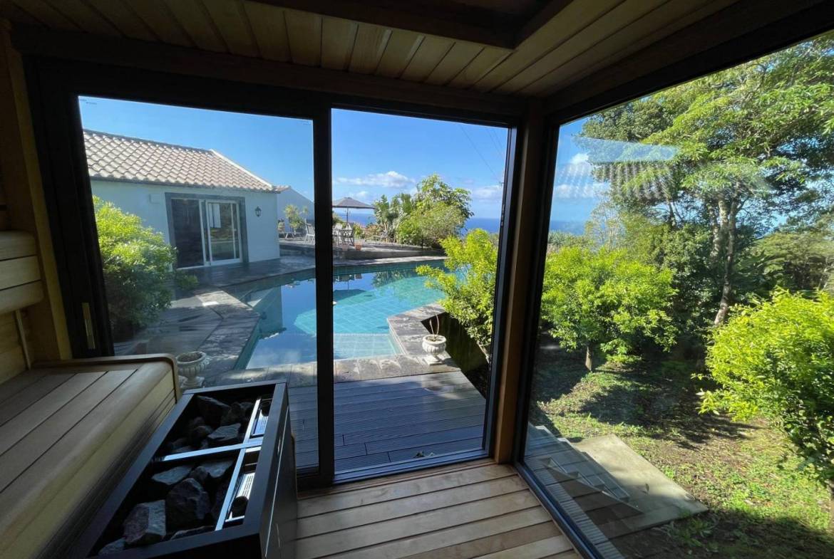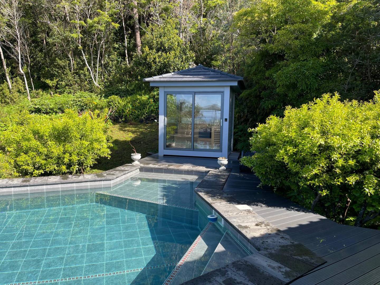 • Het zwembad en de spa: Een glinsterend zwembad met turquoise tegels vormt het middelpunt van het terras. Aan het water grenst een op maat gemaakte sauna met glazen voorkant, waar gasten kunnen ontspannen terwijl ze uitkijken over het bladerdak van het bos.
